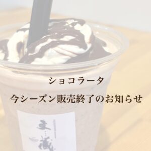 ショコラータ 今シーズン販売終了のおしらせ 未分類 2025.10.01 【ショコラータ 今シーズン販売終了のお知らせ】 日頃よりご愛顧いただき、誠にありがとうございます ご好評をいただいております「ショコラータ」は、9月27日(土)・28(日) をもちまして、今シーズンの販売を終了させていただきます 急なお知らせとなり恐縮ですが、最後の機会にぜひお立ち寄りいただければ幸いです 皆さまのご来店を心よりお待ちしております