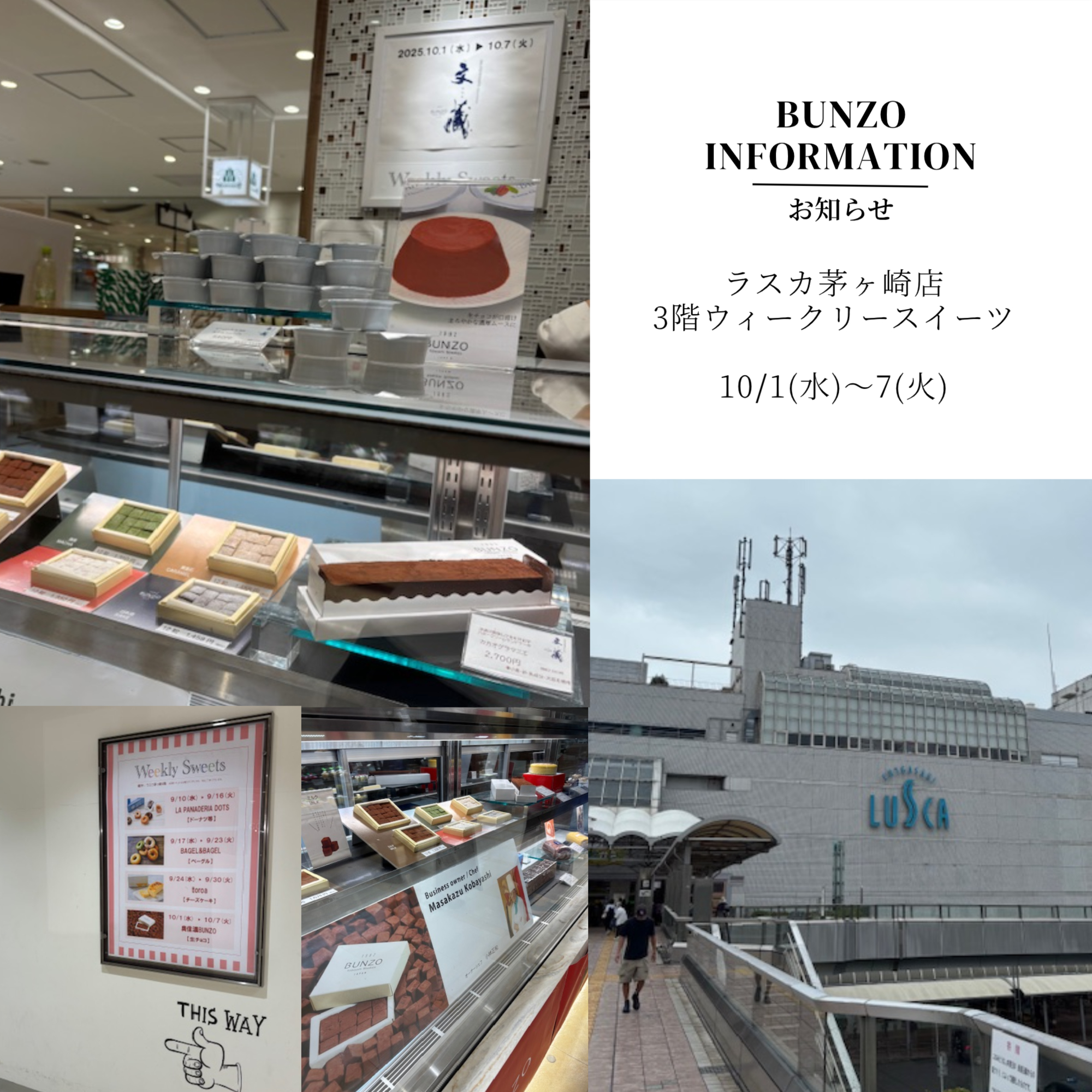 ラスカ茅ヶ崎店 期間限定販売会 未分類 2025.10.01 ✨ラスカ茅ヶ崎店3階ウィークリースイーツにて出店中✨ 10月1日(水)〜7日(火)まで、小林シェフゆかりの湘南の地で開催中です😊 人気の生チョコ12粒やマーブルシフォンなど、定番スイーツをたっぷりご用意🍫🍰 初日からたくさんのご来店、ありがとうございます😭 皆様のお越しを心よりお待ちしております🙇♂️