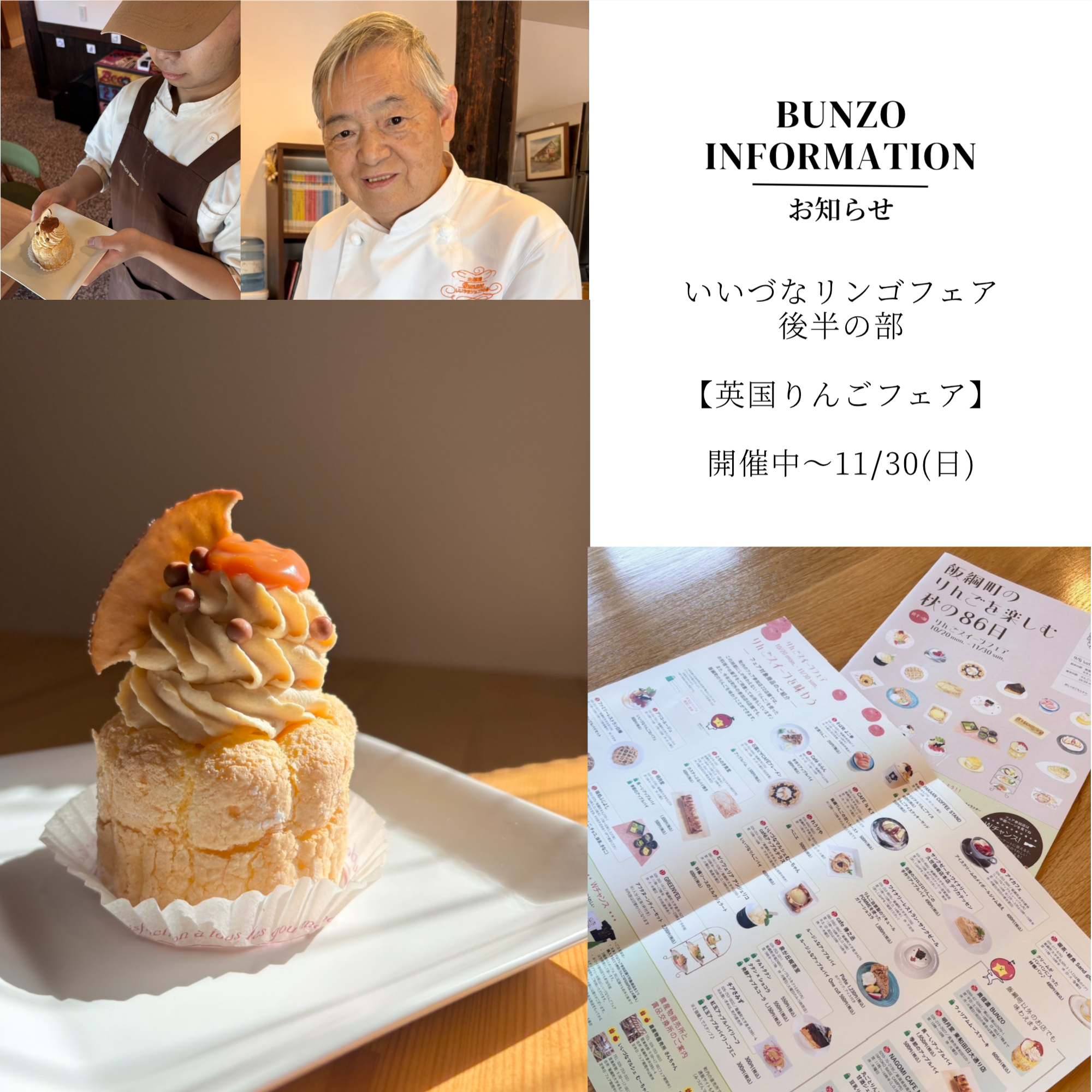 いいづなりんごフェア後半の部 【りんごスイーツフェア】 未分類 2025.10.25 飯綱町のりんごを楽しむ秋の86日🍎 引き続き 【りんごスイーツフェア】に参加させていただいております✨️ 後半の部では、飯綱産「紅玉」を使用したBUNZOオリジナルメニューをご用意しております!前半の部とは違ったメニューをぜひお楽しみください😊 《ウィリアムムースケーキ》 イートイン ¥605/テイクアウト ¥594 期間10/20(月)〜11/30(日) 皆様のご来店を心よりお待ちしております