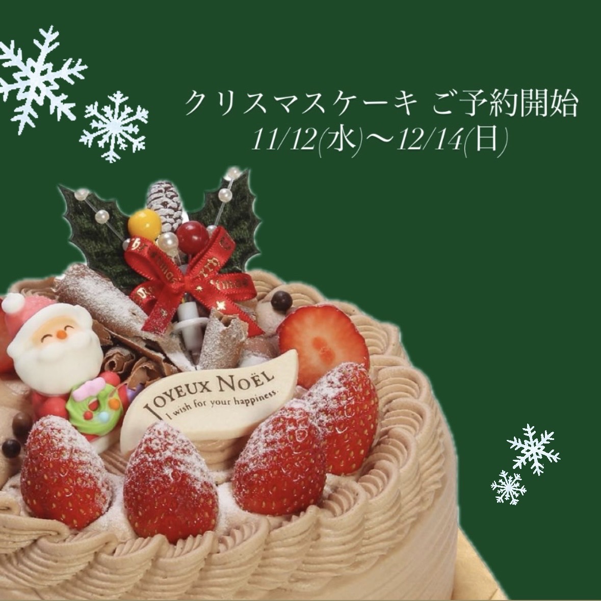 クリスマスケーキ ご予約開始 未分類 2025.11.23 11/12より、クリスマスケーキのご予約を承ります🎄✨ 今年も【限定200台】となっております ・生クリーム ¥4,860(税込) ・生チョコクリーム ¥5,400(税込) 【お渡し日】 12/21(日)〜12/25(木) の間からお選びいただけます🎅 ※お渡しは店頭のみとなります ご予約は 店頭またはお電話にて 承っております📞 受付期間:11/12(水)〜12/14(日) 皆様のご予約お待ちしております☺️